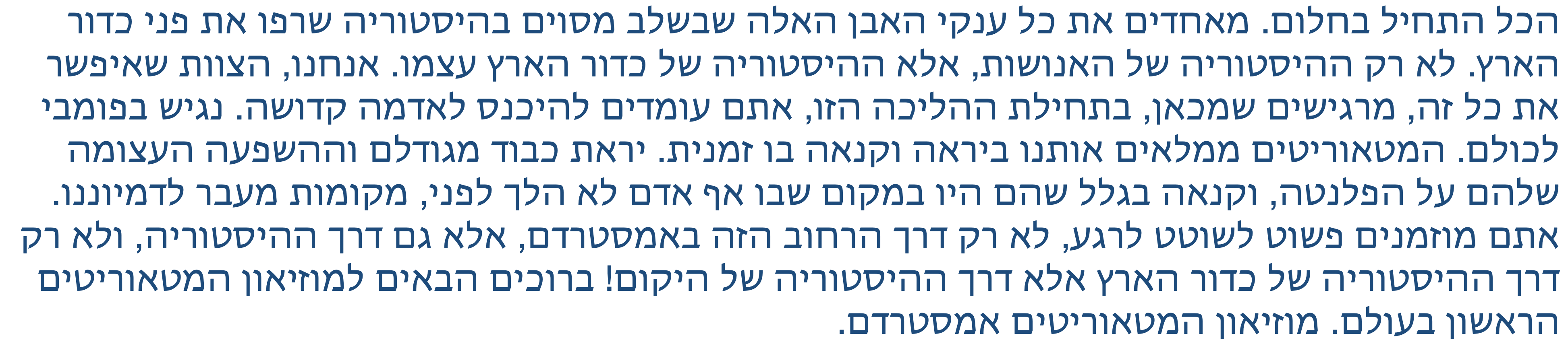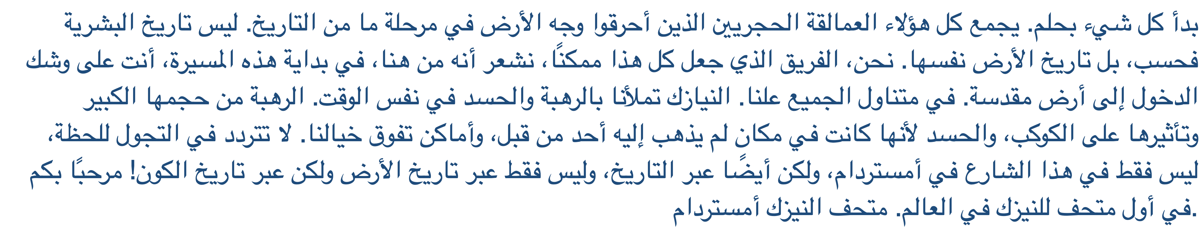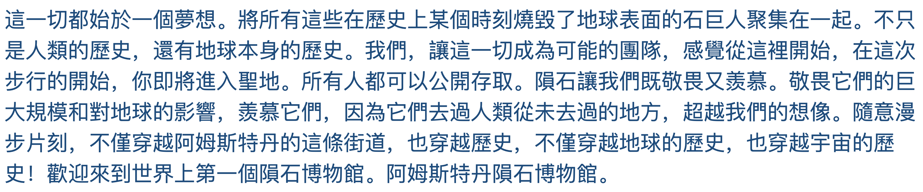 Todo empezó con un sueño. Reuniendo a todos estos gigantes de piedra que, en algún momento de la historia, quemaron la faz de la tierra. No sólo la historia de la humanidad, sino la historia de la Tierra misma. Nosotros, el equipo que hizo todo esto posible, sentimos que desde aquí, al inicio de esta caminata, estás a punto de ingresar a tierra sagrada. De acceso público para todos. Los meteoritos nos llenan de asombro y envidia al mismo tiempo. Asombro por su gran tamaño e impacto en el planeta, y envidia porque han estado donde ningún hombre ha estado antes, lugares más allá de nuestra imaginación. Siéntete libre de pasear por un momento, no sólo por esta calle de Ámsterdam, sino también por la historia, y no sólo por la historia de la Tierra, ¡sino por la historia del universo! Bienvenidos al primer museo de meteoritos del mundo. Museo del Meteorito de Ámsterdam.