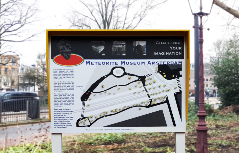 It all started with a dream to bring together all these stone giants that in one point in our history scorched the surface. Not only human history but the history of earth herself. For us, the team that has made all of this possible, we feel that here, on the beginning of this walk you are about to enter sacred ground. Publicly accessable for everyone. The meteorites fill us at the same time with awe and envy. Awe because their shear size and impact on the planet, and envy because they have been where no human has gone before, places beyond our imagination. Feel free to take a moment and wonder around, not only on this street in Amsterdam, but also through history, and not only through earth's history but to the history of the galaxy! Welcome to the first meteorite museum in the world. Meteorite Museum Amsterdam.