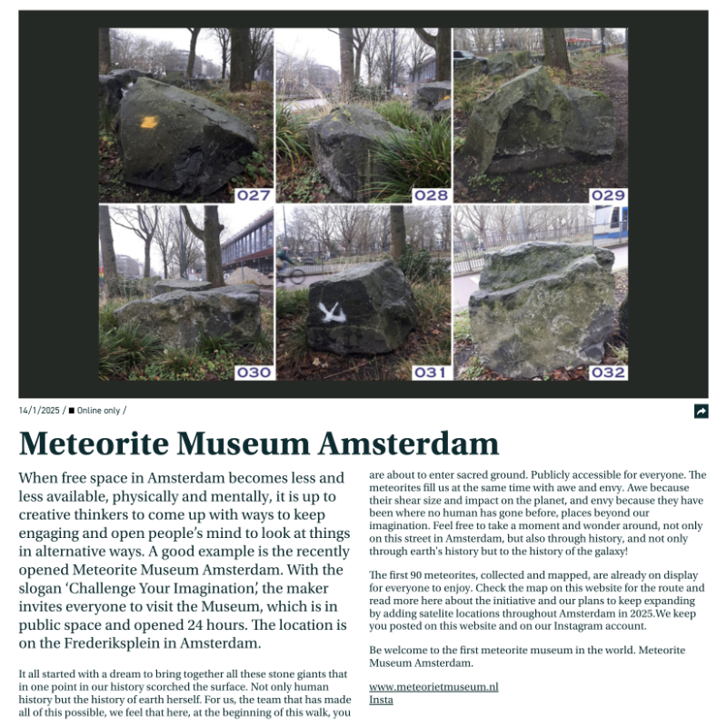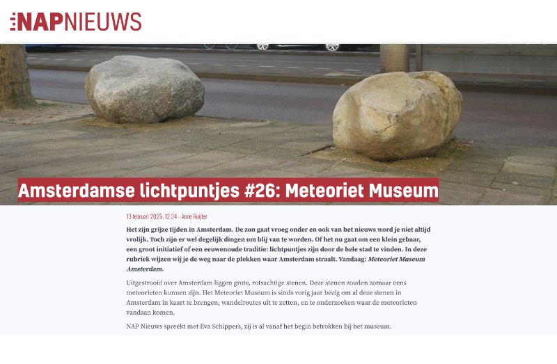 Send a mail to info@meteorietmuseum.nl, also for subscribing to our newsletter. We are happy with donations of any kind: money, objects, ideas, time and [call for] actions.